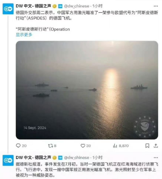 而之前德國外交部表示中國軍方在也門海域對一架參與歐盟“阿斯皮德斯行動”的德國飛機使用了激光武器。這危及德國人員安全並擾亂了行動,是完全不可接受的。中國大使今天被召至外交部。