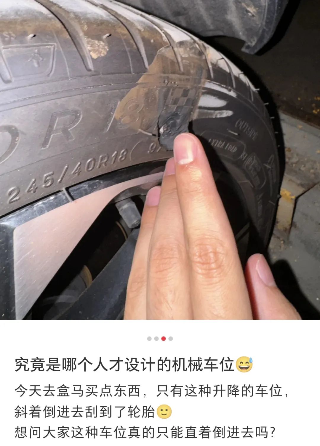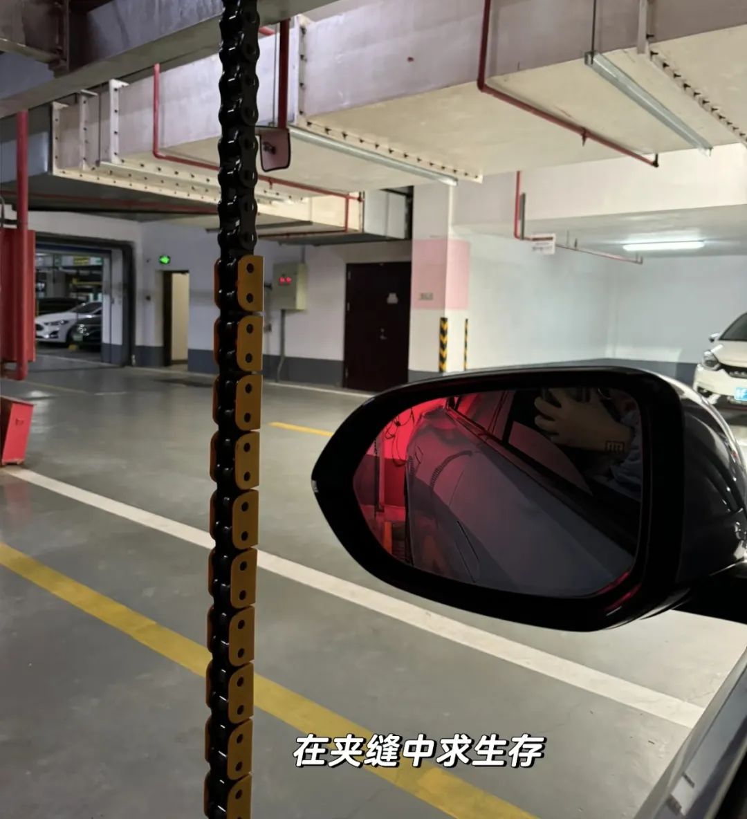 正常倒車入庫的方式是進不來的,很容易刮輪胎,必須直着往裏倒。但凡有一點偏差,就得等着輪轂修復。