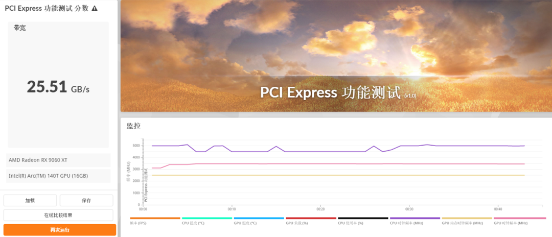 先是 3DMark PCIe 帶寬測試。25.51 GB/s 説明幾乎跑滿了 5.0 x8 的帶寬。這意味着 9060XT 可以完整發揮全部性能。