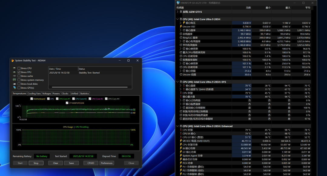説回這次 15 Ultra 內置的英特爾 285H 處理器,至於性能釋放,它和上代保持一致,默認 TDP 為 54W,還是這麼保守。這導致它的極限性能沒有一些 80W 釋放的機型高。