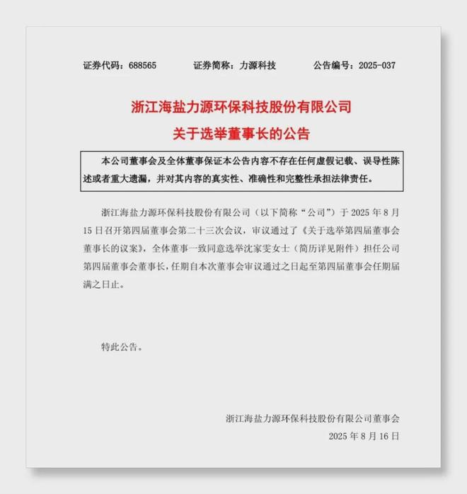 力源科技在2025年8月15日召開的第四屆董事會第二十三次會議上,做出了這一關鍵決定。全體董事的一致同意,意味着沈家雯肩負起引領公司未來發展的重任,任期從此次董事會審議通過之日起,直至第四屆董事會任期屆滿。