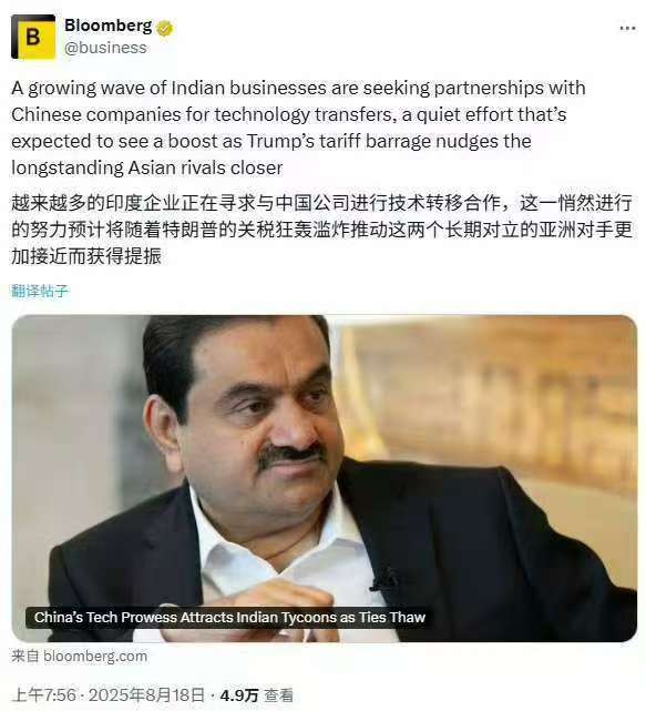 5. 第三個大邏輯,就是中印雙方,都有決定性的“積極合作派”。印度方面,彭博社剛報導,富豪對中國非常看好,很想推進技術合作。印度富豪不是傻子,中國有多強能不知道?以阿達尼為代表的印度寡頭,幾乎是公開大搞中印合作。中印關係壞成這樣,對印出口還大增,就是寡頭們的作用,中國商品確實好。