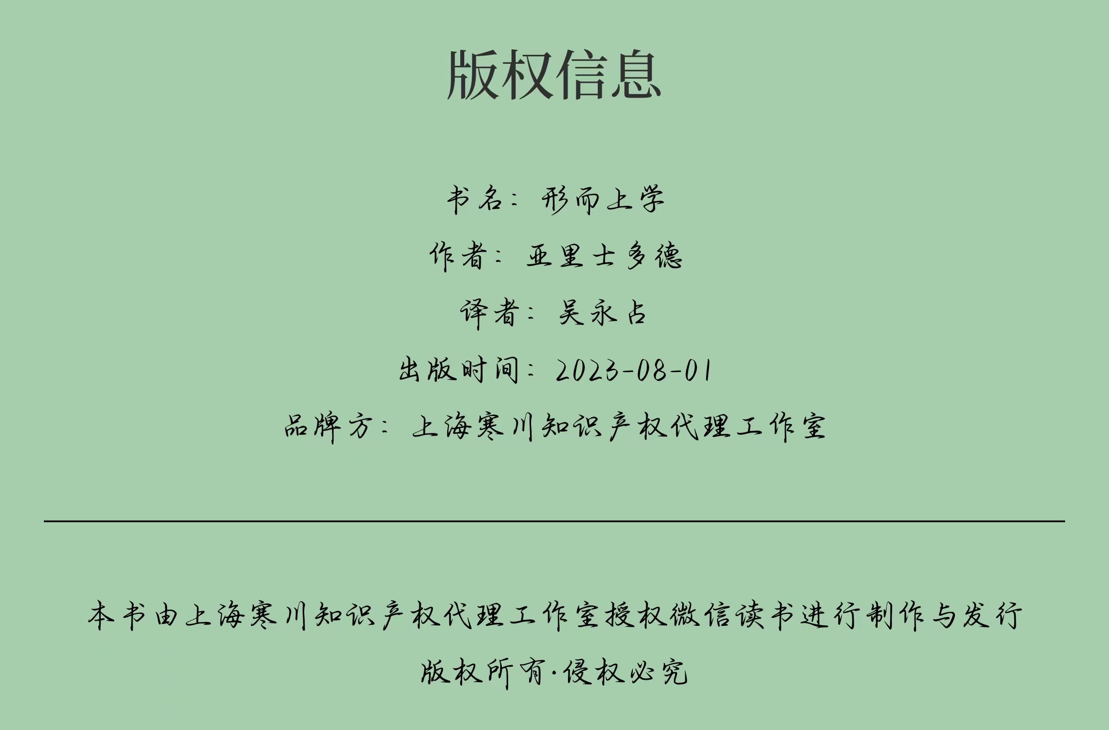話説回來,《形而上學》這本書到底怎麼樣呢?嗯,那個,誒,哈,實在不怎麼樣!除了其哲學內容符合一般西方哲學家的特點,也就是繞性十足——不把你繞死算他輸之外,我實在不願意承認這樣的書是號稱古希臘三聖之一,偉大的哲學家、科學家和教育家,其著作廣涉倫理學、形而上學、心理學、經濟學、神學、政治學、修辭學、自然科學、教育學、詩歌、風俗,以及法律,以一人之力構建了西方哲學的第一個廣泛系統,包含道德、美學、邏輯和科學、政治和玄學的亞里士多德的力作,哎呀呀,又把我累得夠嗆!這麼説吧,這本書邏輯架構上十分混亂,語言文字十分普通。更讓人接受不了的是行文十分囉嗦,例如,全書至少幾十處有“我的意思是,舉個例子來説”語句,邏輯不通、浪費筆墨,真難以想象這是出自資源十分匱乏的兩千多年前的書,更難以想象的是,它是出自身兼修辭學、美學、邏輯學大家的亞里士多德之手。如果拿《形而上學》跟中國古代先賢的作品相比,那實在是…..先秦時代流傳到現在的書,那可是添一字則多,減一字則少,《形而上學》又如何能夠相比?關於這本書的情況,大家可以讀一讀,自己感受感受。我讀的是吳永佔翻譯版,由上海寒川知識產權代理工作室製作的電子書。