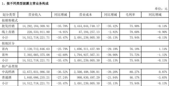 2025年上半年,按產品類別劃分,洋河股份中高檔酒和普通酒同比分別下滑36.52%、27.24%;按銷售模式劃分,公司批發經銷和線上直銷同比分別下滑35.78%、6.91%;按地區劃分,公司省內和省外同比分別下滑25.79%、42.68%。
