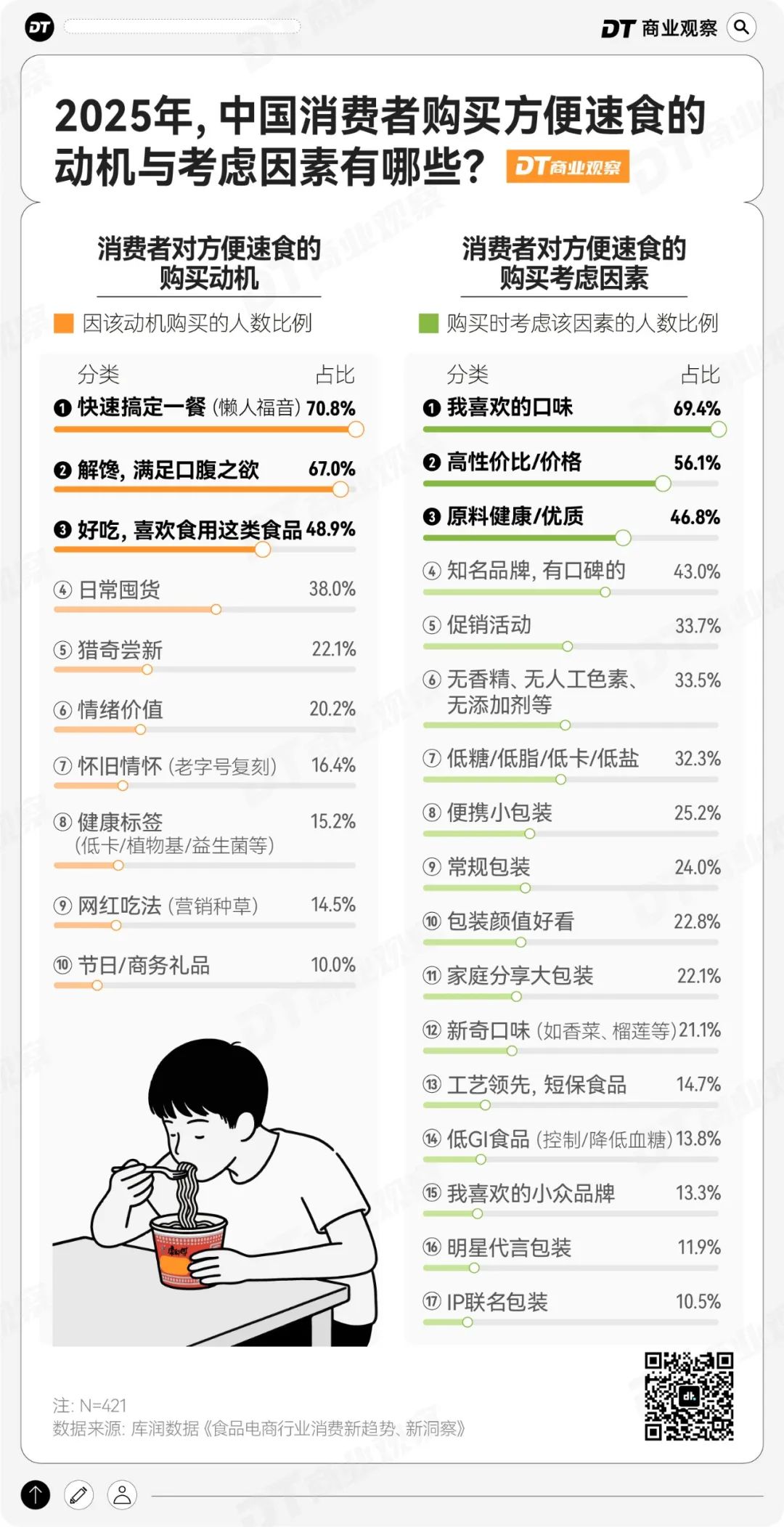 根據庫潤數據發佈的《食品電商行業消費新趨勢新洞察》,2025年中國消費者方便速食的購買動機中,“快速搞定一餐”位列首位;隨後是“解饞”“好吃”等口感價值需求。