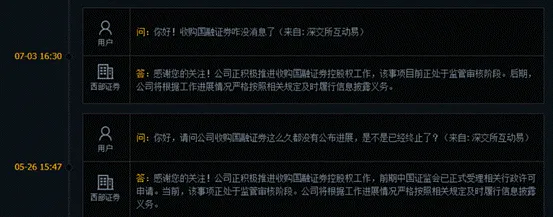 在今年5月西部證券舉辦的兩次投資者關係活動中,以及公司互動平台上,“收購國融證券的進展”都是被問及最多的話題,但公司均回應,正積極推進,尚處於監管審核階段。直至8月15日,隨着這紙批文的落地,這場歷時14個月的併購終於有了確定性。
