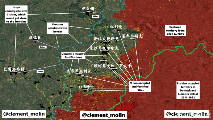 在過去三年的戰鬥中,俄羅斯只佔領了一座“大”城市(8 萬居民)和一些較小的城鎮,這些城市加起來人口只有25萬。而特朗普要求放棄的這9座城市一共60萬人口。