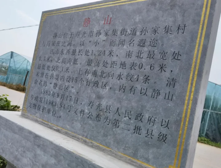 王先生告訴記者,根據1935年的《壽光縣誌》首次記載:縣城西南8公里孫家集與馬家莊之間,有一山石露出地面,名靜山。這個描述本身並未明確説這是一座山,僅稱其為山石。