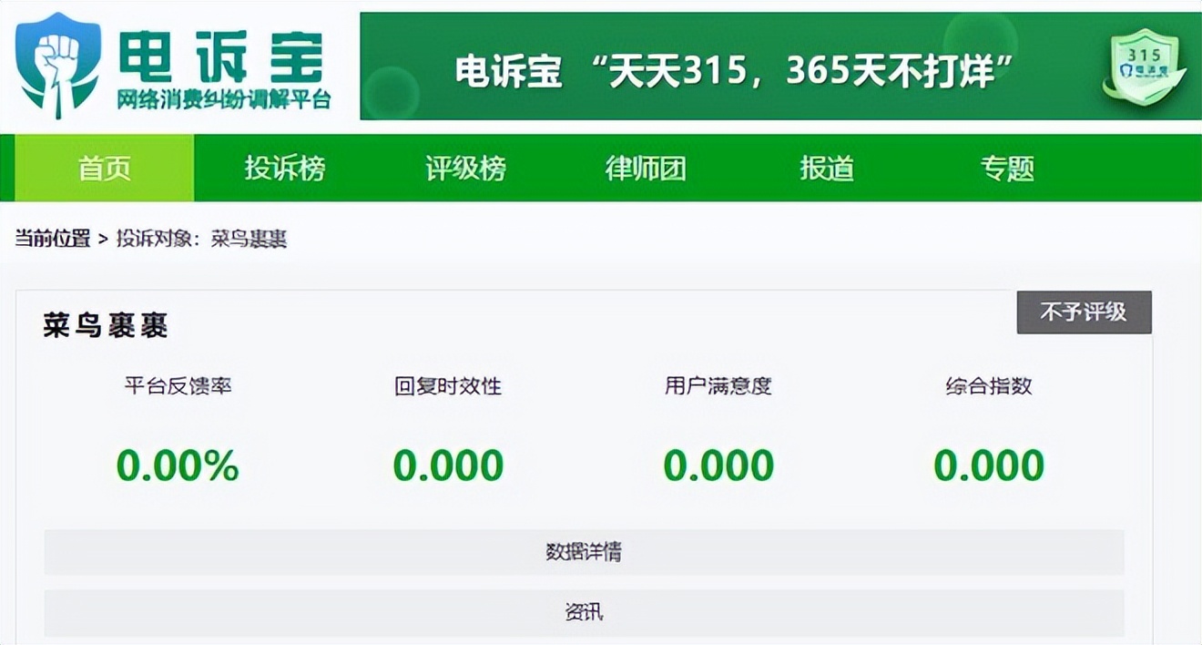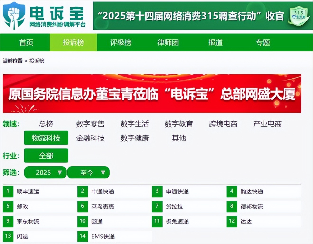 2025年至今,“電訴寶”受理投訴中涉及的物流科技領域用户有效投訴顯示(依據投訴量排行),“菜鳥裹裹”排名第6位。最新評級為“不予評級”。
