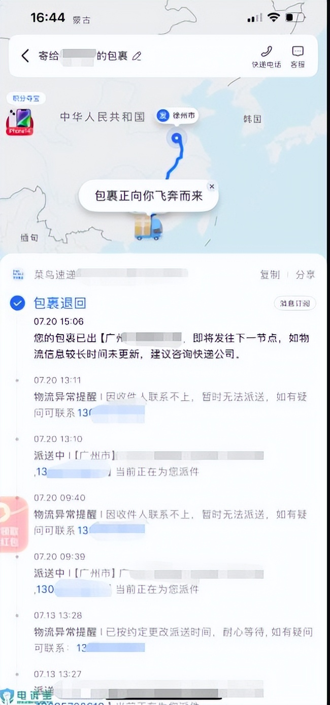 1月14日,天津市的許女士向電訴寶投訴稱其於2024年12月27日在泰州海陵財富廣場西南門店菜鳥驛站寄件後,1月7日被上海商家告知收到非本人操作的退貨快遞(單號與姓名不符)。經查支付寶快遞記錄,發現2024年12月27日至2025年1月14日期間,竟有96單冒用其姓名和手機號從同一驛站發出的快遞,地域分佈廣泛且持續至用户離泰州後。用户質疑驛站管理漏洞導致個人信息被用於刷單等非法用途,要求菜鳥徹查信息泄露環節並承擔相應責任。