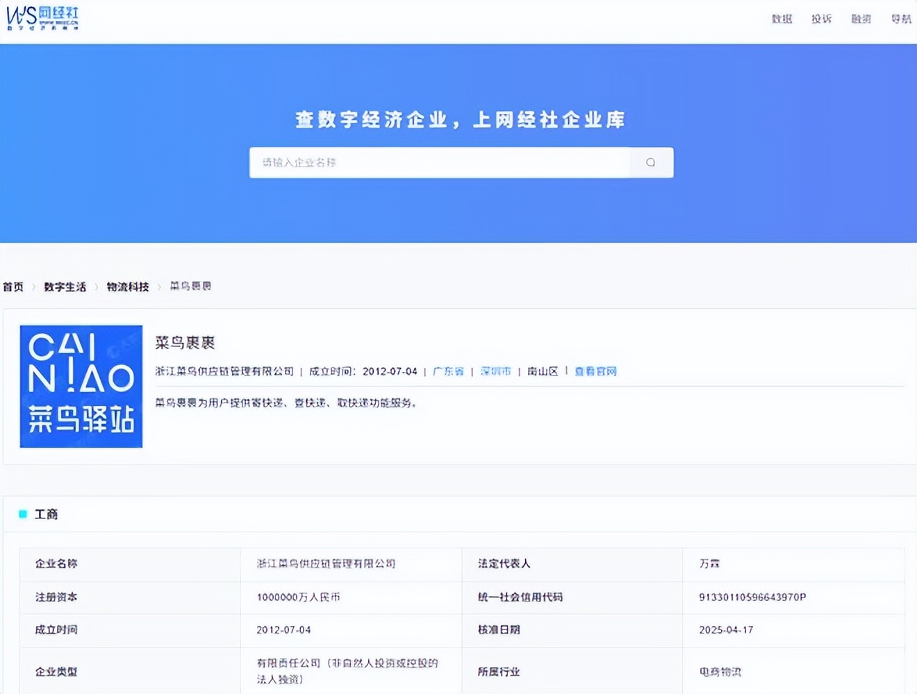 網經社企業庫顯示,“菜鳥裹裹”屬於浙江菜鳥供應鏈管理有限公司,成立於2012年,法定代表人為萬霖。