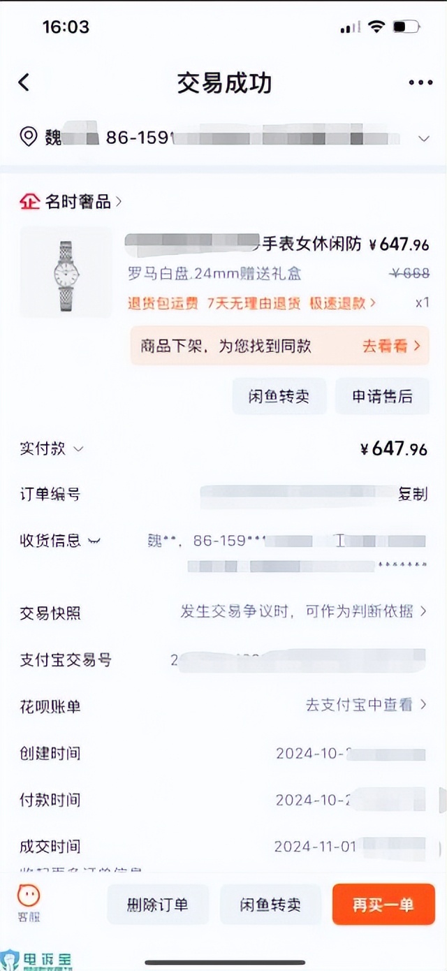 8月6日,江蘇省的魏女士向電訴寶投訴稱其於7月8日通過菜鳥裹裹平台寄送一塊價值674.96元的手錶至廣州維修,包裹在運輸過程中丟失。魏女士稱已提供購買憑證等證據,但菜鳥速遞以**“無法證明寄出物品即為該手錶”**為由拒絕全額賠付。魏女士認為此理由荒謬,強調自己親手將手錶交給快遞員,但未拍照留證,物流公司藉此推諉責任。