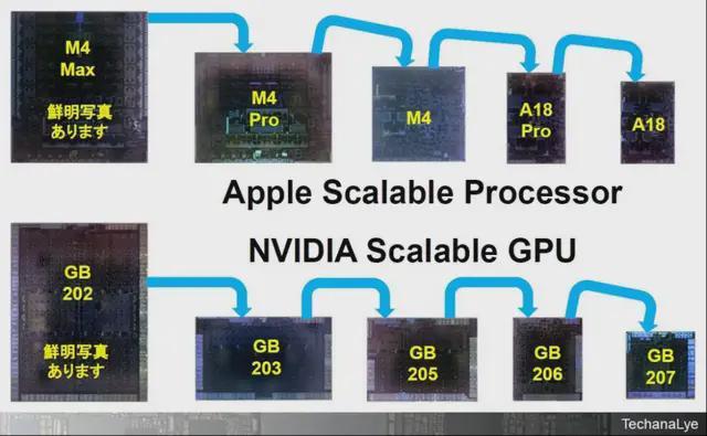 Apple 和 NVIDIA 處理器均採用單一的可擴展設計。高端處理器佔據了整個產品線的主導地位,隨着產品線的下移,CPU 和 GPU 核心的數量會逐漸減少。同時,內存接口通道和 PCI Express 通道的數量也會減少。sho, uchiku, ume 設計僅根據核心數量進行調整。一旦設計難度最高的超高端處理器完成,整個產品線就可以通過單一、持續的精簡流程打造出來。