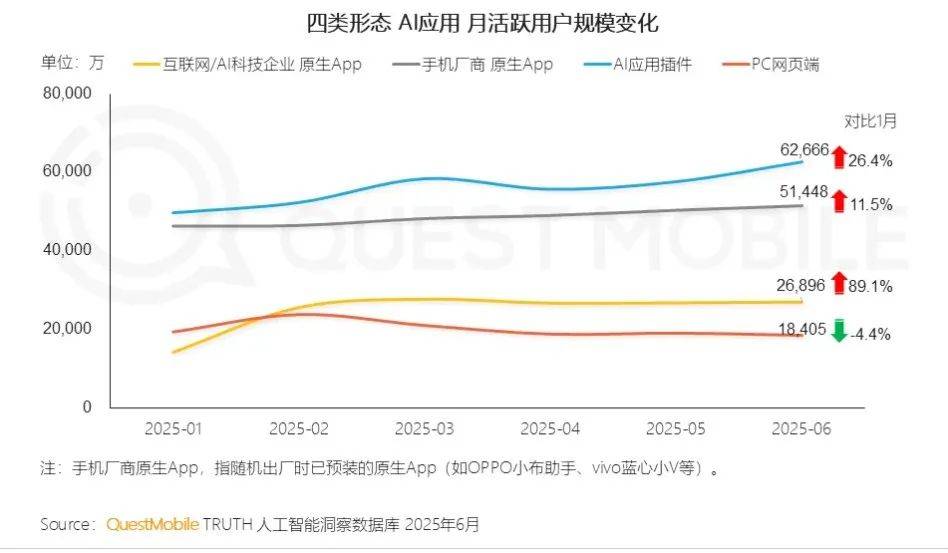 近期QuestMobile發佈的《2025年AI應用市場半年報》提供了一種新的可能性。報告披露,截止到2025年6月,移動端原生AI應用用户規模為5.7億,而更大的市場藏在應用插件裏,同期移動端-應用插件(In-App AI)用户規模達到6.3億,已經超越了原生AI應用。