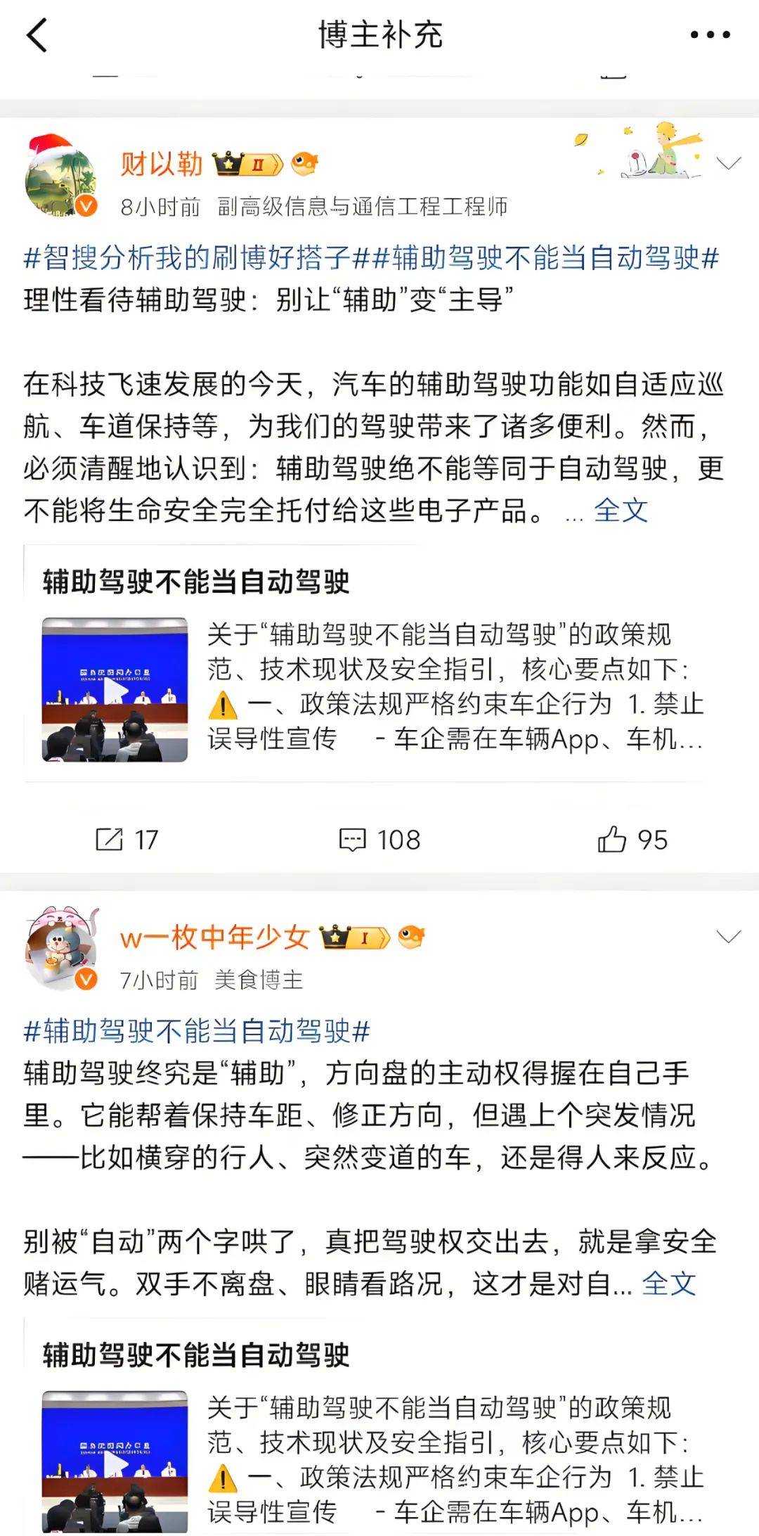 **值得注意的,是微博智搜的信源引用數量。除了權威媒體對事件本身的公開報道以外,微博還引用了數十條相關博文用於分析輔助駕駛的技術等細節。**這些內容來源包括輔助駕駛領域其他話題的媒體報道、大V博主的相關博文、交通監管部門的提醒公告等。同時在搜索結果末尾,微博智搜附上了博主補充解讀。