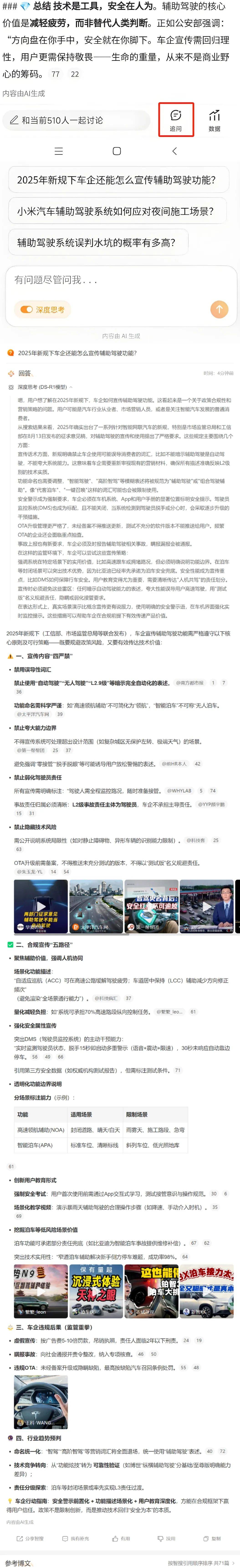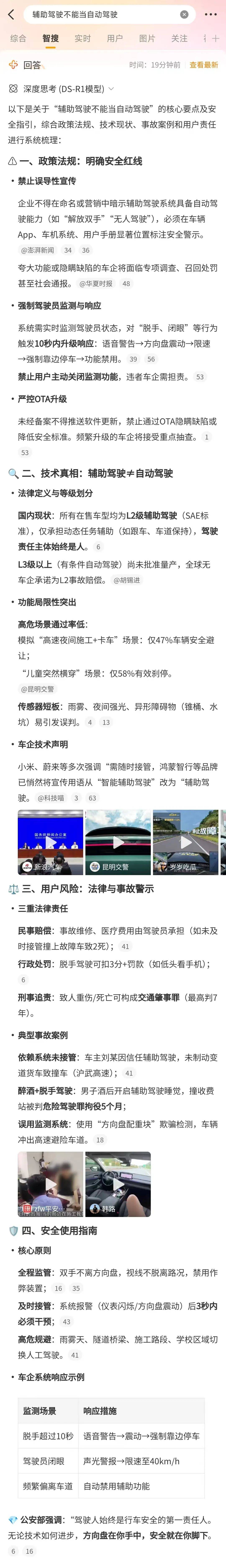 如在“輔助駕駛不能當自動駕駛”智搜結果下,選擇“追問”可自動獲取推薦檢索問題,選取後可生成同樣詳盡的回答。