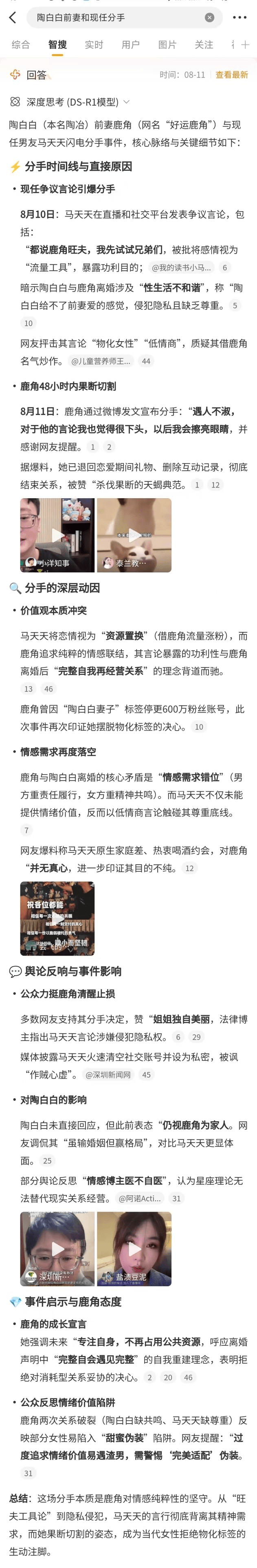 **而在熱點吃瓜類事件中,微博智搜更能展現出平台熱點傳播速度快、吃瓜生態健全的優勢。**以網紅博主陶白白的情感糾紛為例,相關事件錯綜複雜,普通用户很難在短時間內梳理清楚,而微博智搜能在短時間內給出事件每一步的清晰脈絡,並將當事人深層動因、網友主流評價、事件的輿論影響完整展現,做到真正意義上的一鍵吃瓜。