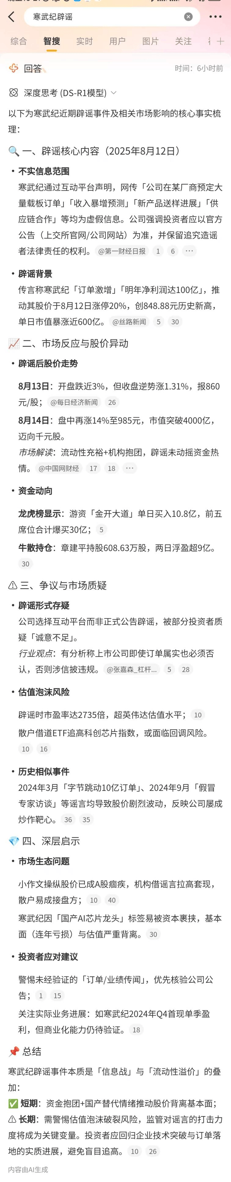 以近期寒武紀闢謠訂單謠言為例,相關聲明發布後迅速在微博上獲媒體轉發,相關內容則被迅速收入微博智搜,並形成從官方聲明到市場反應、市場質疑、事件解讀的完整分析。