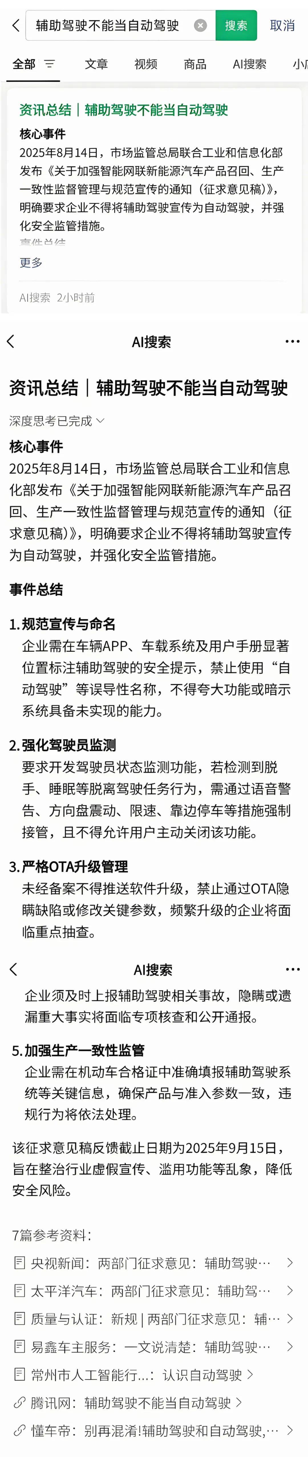 而微信AI搜索的核心優勢,明顯在於公眾號這一獨家內容生態。在輔助駕駛熱點搜索結果中,微信AI搜索以7篇微信公眾號文章為參考文獻,實現了對熱點信息較為準確的梳理與解析。