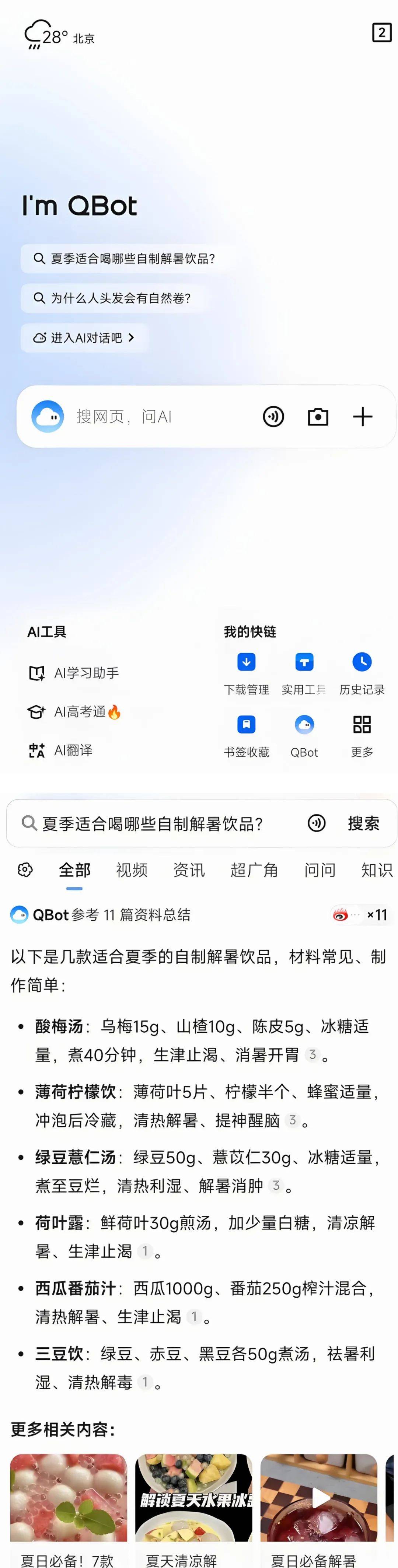 以QQ瀏覽器為例,今年5月,QQ瀏覽器宣佈升級為AI瀏覽器,並用AI搜索取代原首頁內容。從實際體驗看,其Qbot AI側重生活百科類對話解答,其首頁內容即引導用户向AI提問百科類問題,如“夏季自制解暑飲品”等。