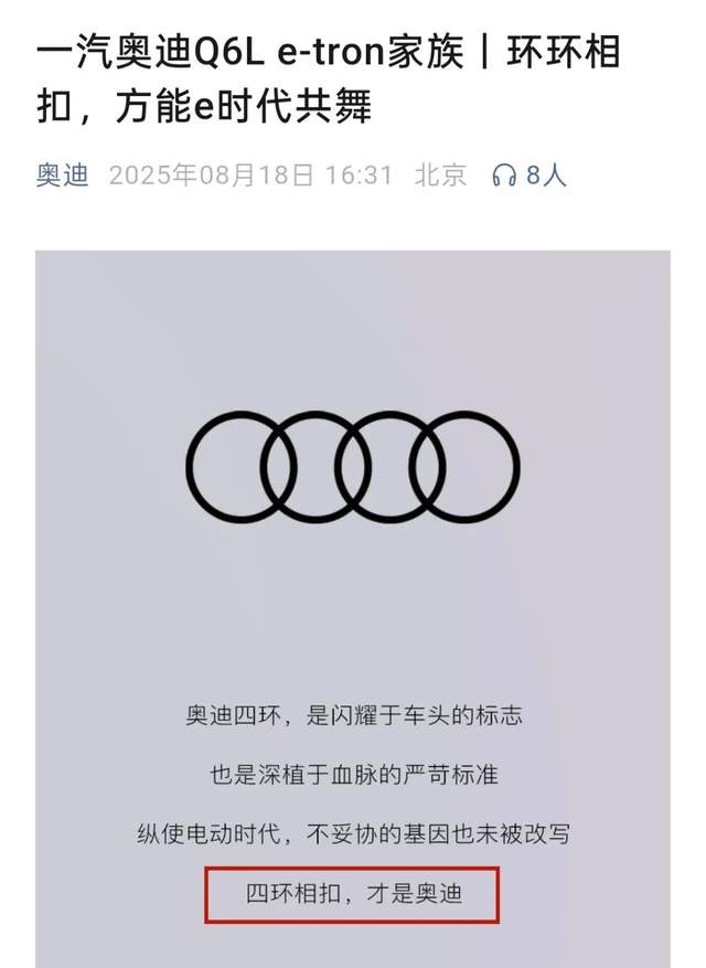 論內卷,一汽奧迪近期算是把技能點滿了。在上汽奧迪E5 Sportback(以下簡稱E5)公佈預售價的同一天,前者官方公眾號發文暗諷改用字母奧迪logo的上汽奧迪新車不夠奧迪。