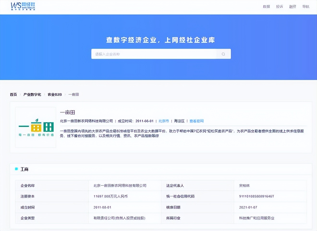 網經社企業庫顯示,一畝田隸屬於北京一畝田新農網絡科技有限公司,成立於2011年8月1日,法定代表人為宋柏林。該平台自稱國內領先的大宗農產品交易B2B誠信平台及農業大數據平台,致力於幫助中國7億農民“輕鬆買賣農產品”,為農產品交易者提供全面的線上供求信息服務、線下撮合對接服務,以及相關行情、資訊、農產品指數等。