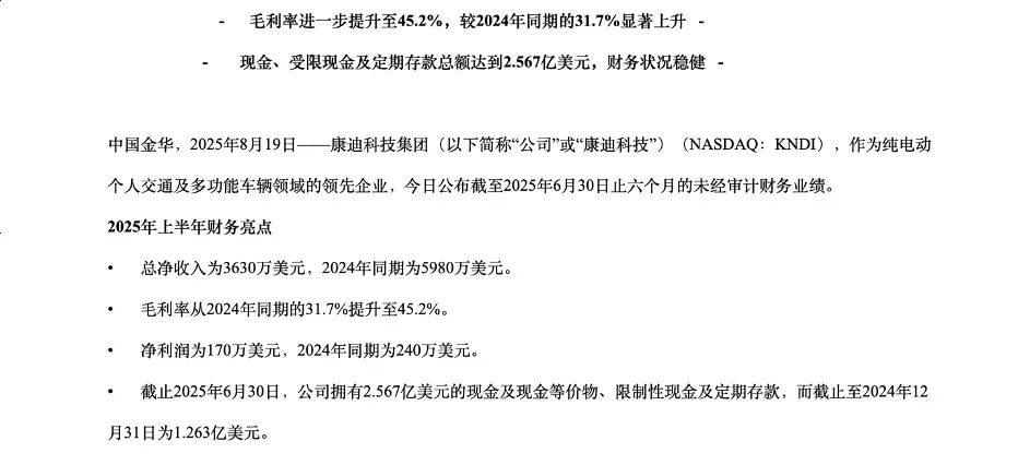 康迪科技(KNDI.US)8月19日發佈第二季度及上半年業績公告,並召開財報電話會議。根據財報顯示,康迪2025年上半年實現營業收入3630萬美元,毛利1640萬美元,毛利率較2024年同期提升13.5%。淨利潤為170萬美元,較2024年同期下降28.7%。
