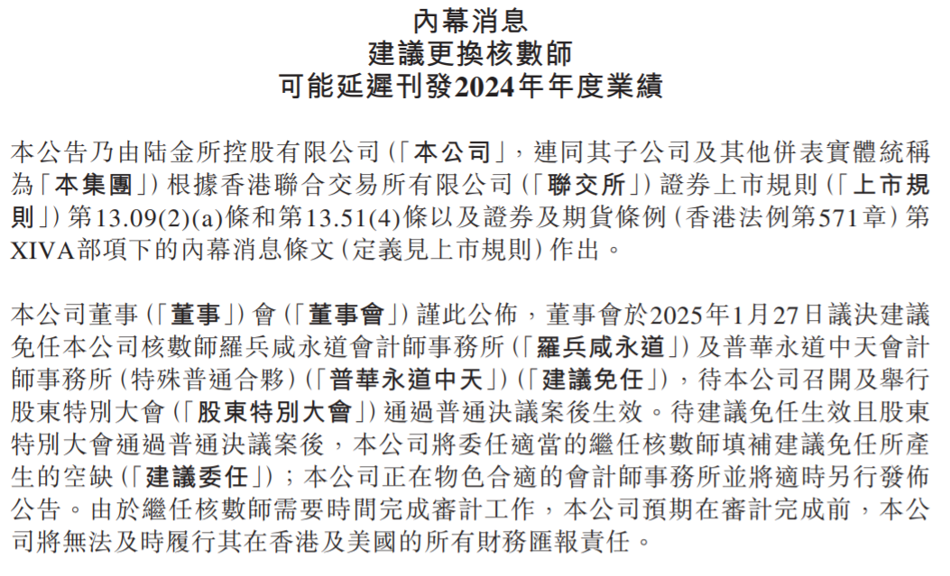 2025年1月16日,陸金所通知普華永道,解聘其核數師職務。