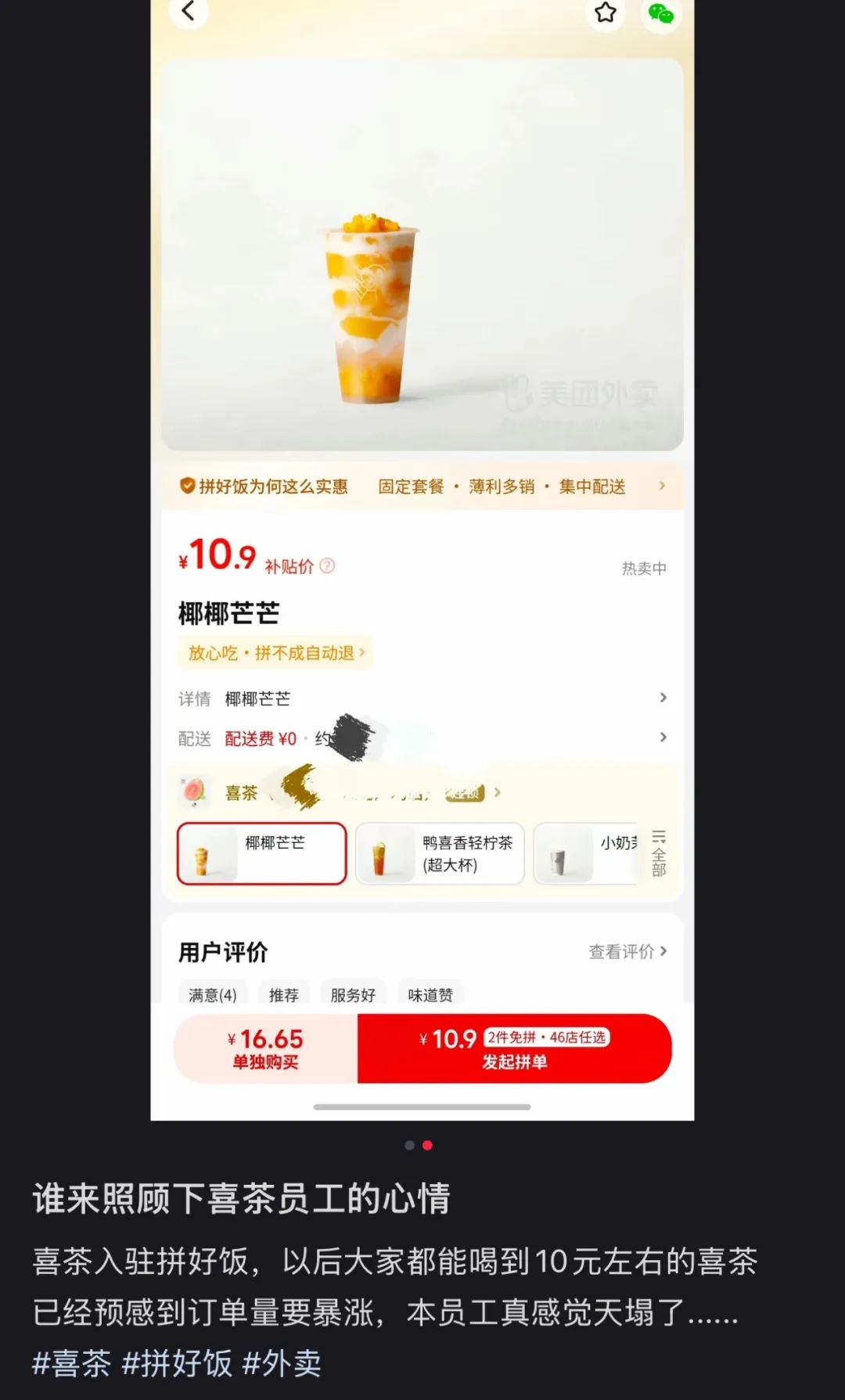 正因此,喜茶低調上線美團拼好飯,雙方合作主要集中在低線城市。在貴州、河南、浙江等省份,喜茶也得到了不少消費者的好評。**以拼單價喝到喜茶的年輕消費者,大多給出了“喜茶接地氣”“第一次喝喜茶,味道確實不錯”等評價。**這是喜茶和美團之間一次更深入的合作,雙方是在新茶飲行業共同尋找增量市場。