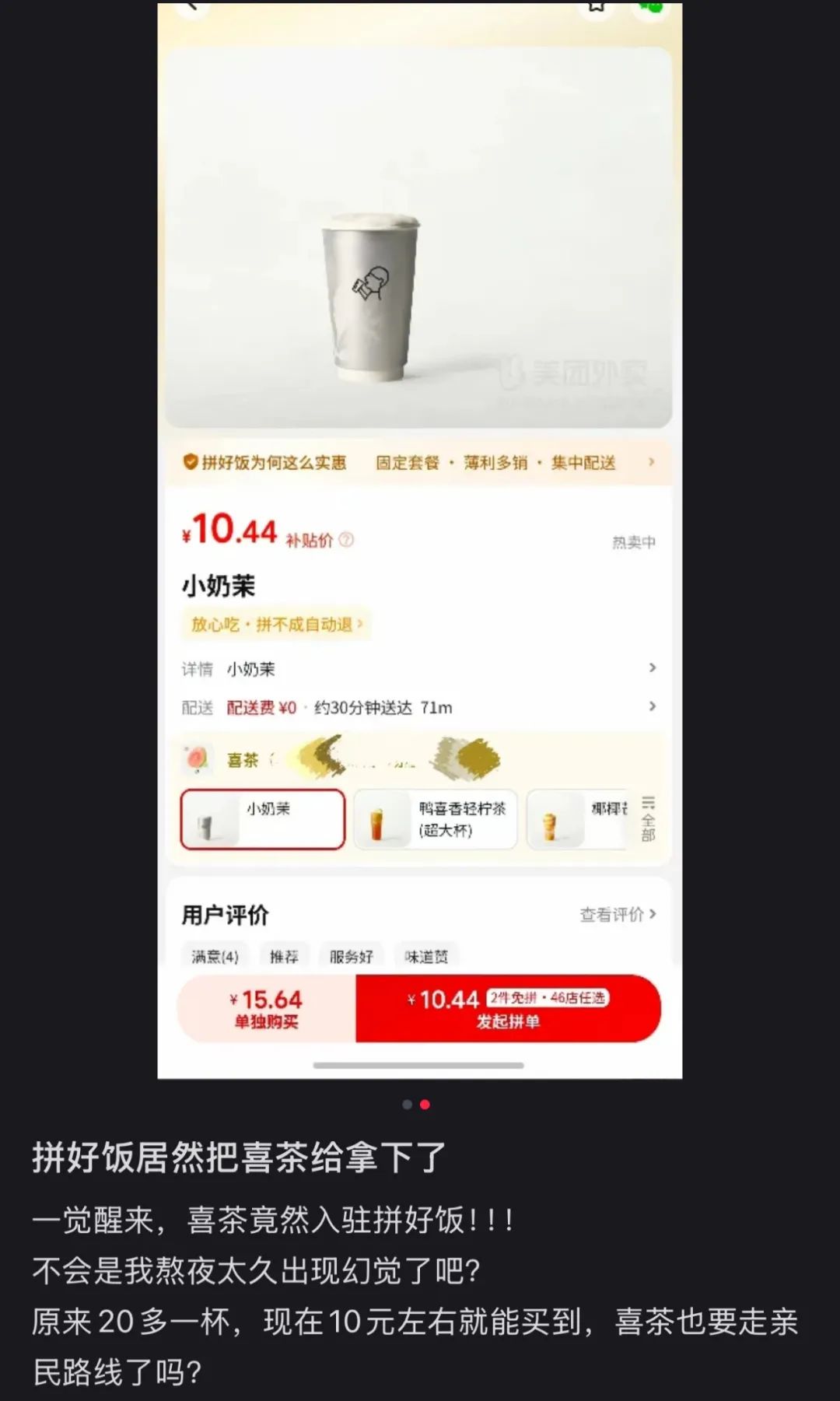 正因此,喜茶低調上線美團拼好飯,雙方合作主要集中在低線城市。在貴州、河南、浙江等省份,喜茶也得到了不少消費者的好評。**以拼單價喝到喜茶的年輕消費者,大多給出了“喜茶接地氣”“第一次喝喜茶,味道確實不錯”等評價。**這是喜茶和美團之間一次更深入的合作,雙方是在新茶飲行業共同尋找增量市場。