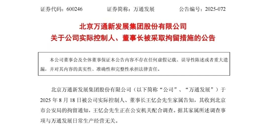 A股上市公司萬通發展現任董事長王憶會被北京警方帶走。家屬説,這次調查事項與公司日常生產經營活動無關。股價表現看起來可不像,公告披露當天,萬通發展開盤後很快跌停。挺戲劇性,拘留公告公佈之前,萬通發展因為宣佈要收購一家高速互聯芯片研發企業迎來股價暴漲。