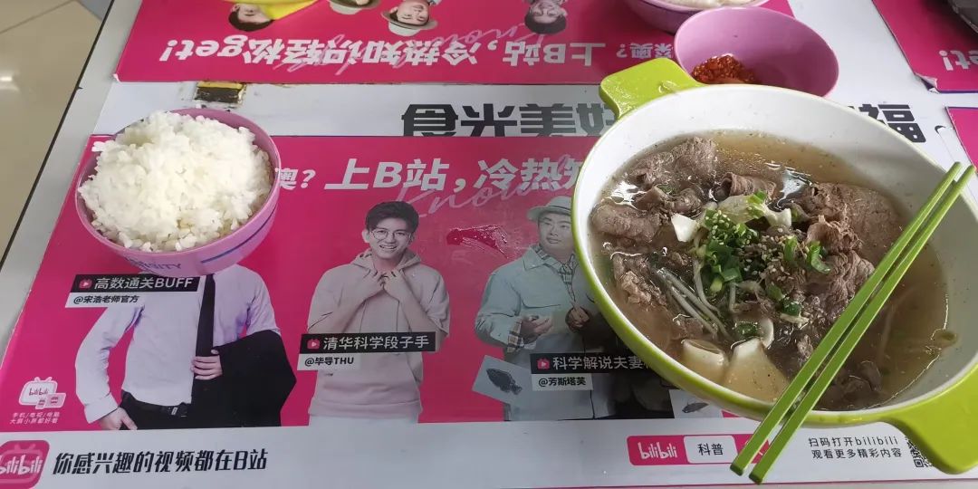 分享一張圖,在我當了UP主又博士復學後,發現食堂桌子上竟然有自己的海報!每次去桃李二樓吃牛肉,我都會把碗放自己臉上吃飯,頗有滋味!
