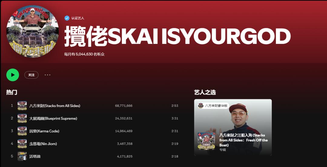 隨着《八方來財》《大展鴻圖》的接連爆紅,直接讓攬佬完成了本土説唱圈的光速升咖和華語歌手難以企及的國際化。今年7月7日,攬佬以月聽眾數突破302.2萬的成績超越周杰倫,登頂Spotify華語歌手月聽眾數第一名。最近,攬佬在Spotify平台上的月聽眾數更是首次突破500萬,創下個人及華語音樂的新紀錄。