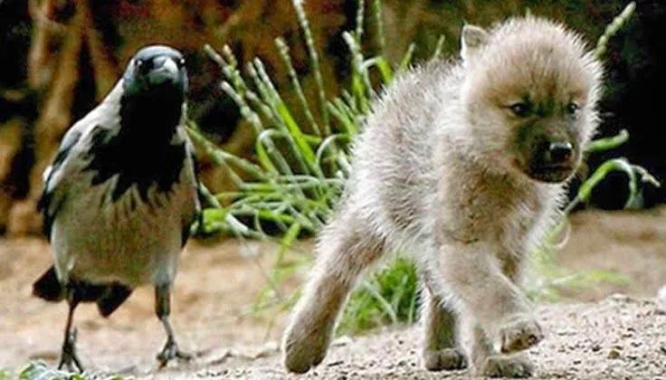 還有自然愛好者曾拍攝到渡鴉在狼窩周圍,陪狼崽玩遊戲的畫面(圖片來源:網絡)