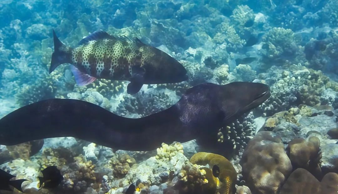 青星九棘鱸(上)和爪哇裸胸鱔(下)一起捕獵中(圖片來源:Alex Veil)