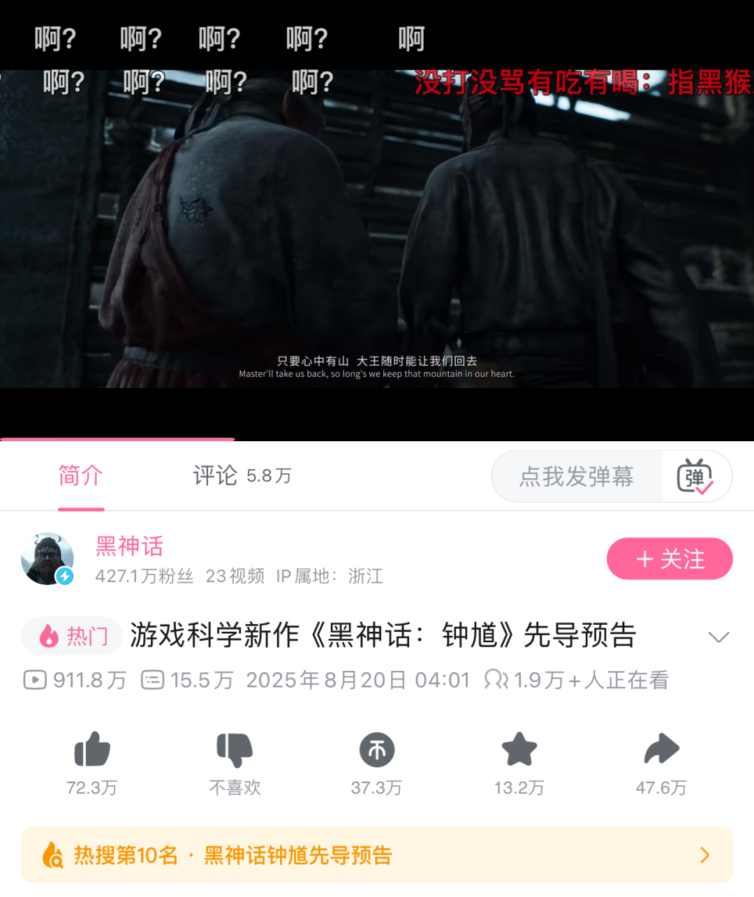 在海外遊戲大展中壓軸亮相,《黑神話:鍾馗》這波可謂是“排面”拉滿了,另一邊在國內的媒體平台上,儘管尚無實機畫面曝光,但僅憑CG預告,已在B站突破900萬播放、5萬評論,話題#馮驥楊奇談黑神話鍾馗#也火速衝上微博熱搜。