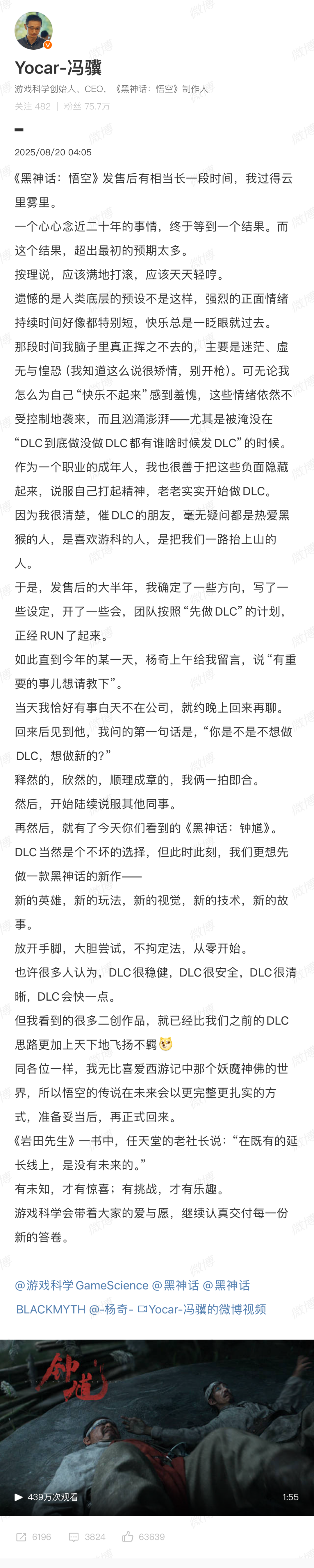 遊戲科學創始人、CEO、《黑神話:悟空》製作人馮驥發佈微博表示,團隊決定暫緩悟空DLC開發,轉而聚焦全新項目《黑神話:鍾馗》。他直言:“DLC當然是個不錯的選擇,但此時此刻,我們更想做一款全新的黑神話作品——新的英雄、新的玩法、新的視覺、新的技術、新的故事。悟空的傳説未來會以更完整、更紮實的方式,準備妥當後再回來。”