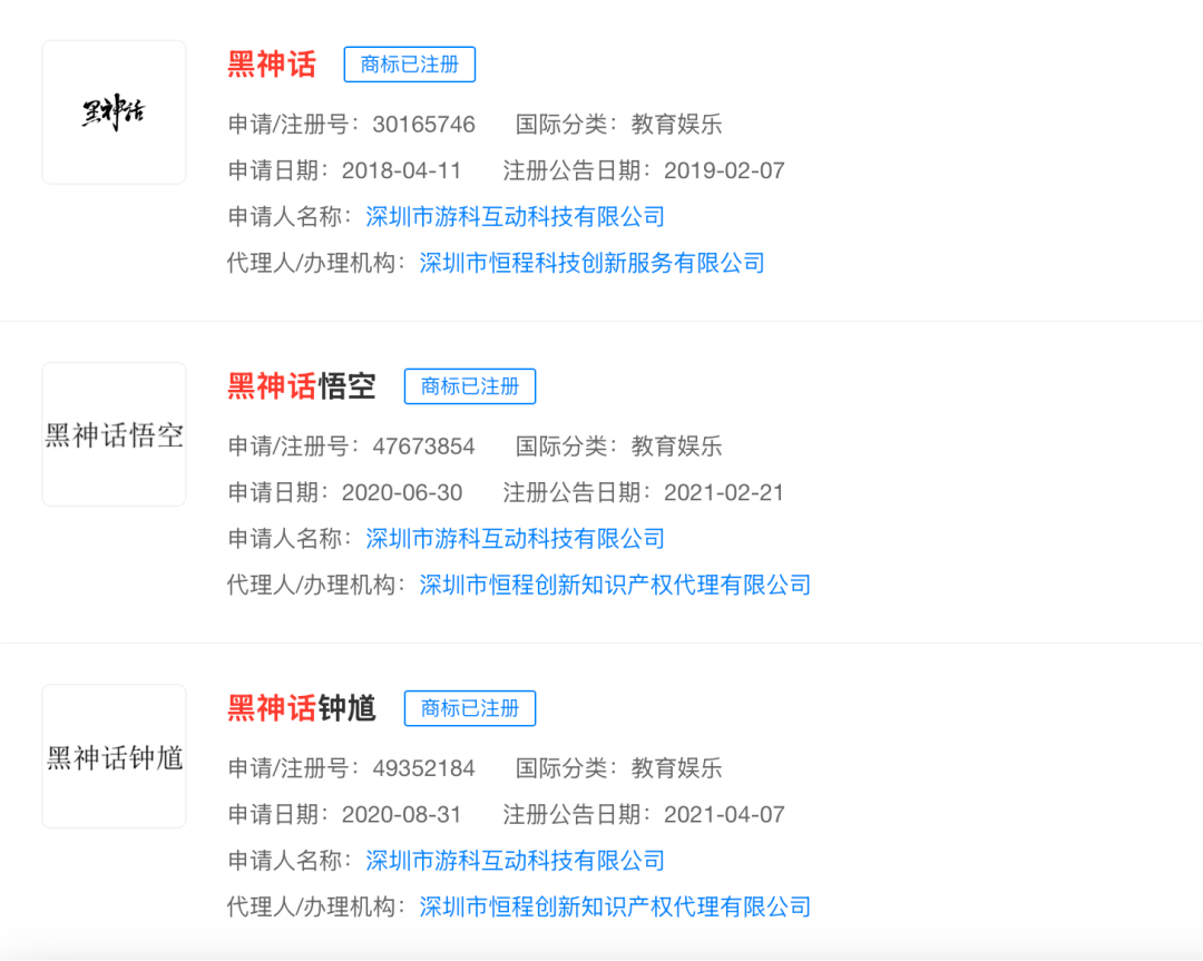 “黑神話宇宙”或許早在2020年就已開始佈局。《IT時報》記者注意到,天眼查信息顯示,早在2020年,《黑神話:鍾馗》《黑神話:姜子牙》《黑神話:小倩》等商標便已與《黑神話:悟空》同步註冊。