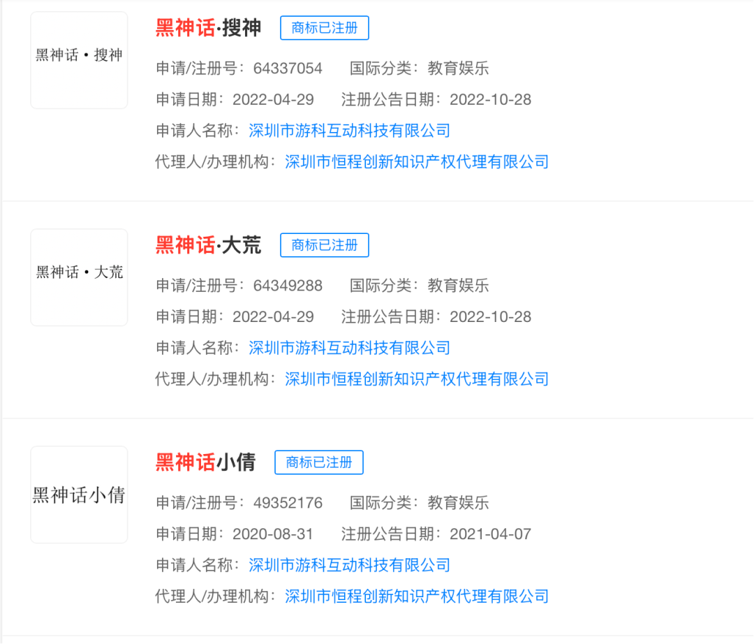 2022年,遊戲科學進一步註冊了《黑神話:山海》《黑神話:大荒》《黑神話:搜神》等多個商標。就在今年年初,遊戲科學還成立了杭州黑神話文化有限公司,註冊資本1000萬元,法定代表人為楊奇,經營範圍包括組織文化藝術交流活動、數字創意產品展覽展示服務、文藝創作等。股東信息顯示,該公司由杭州遊科互動科技有限公司全資持股。最終受益人信息顯示,該公司實際控制人為馮驥。
