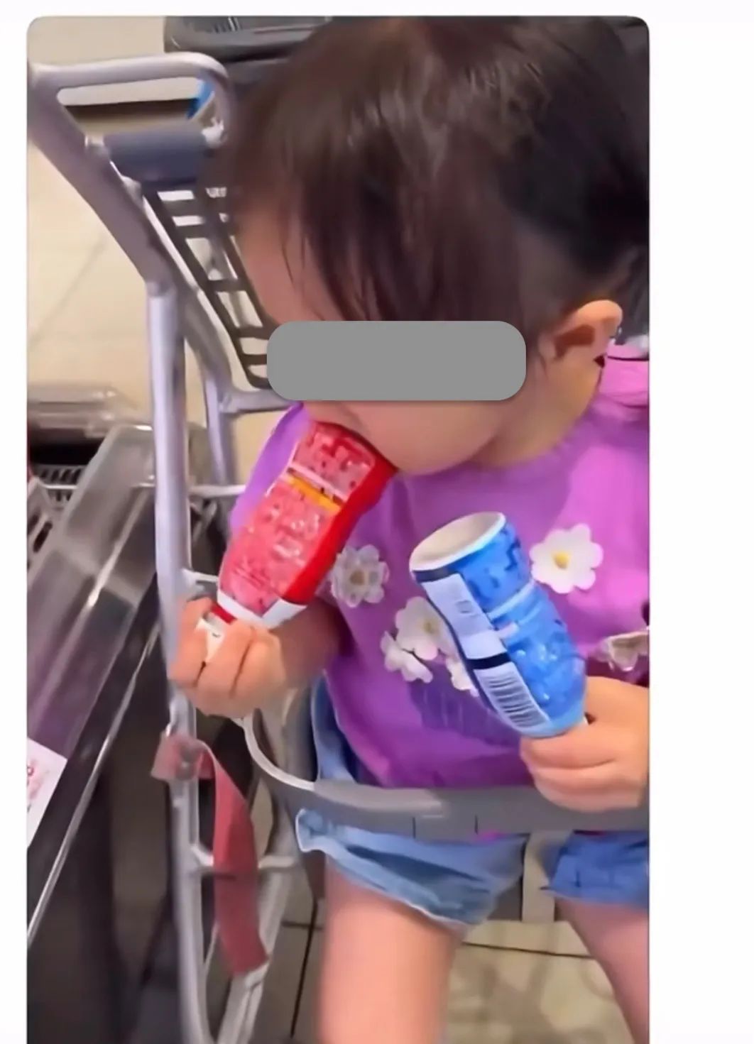 最後小孩還是聽媽媽的話,將嘴巴那瓶飲品放回貨架。與此同時,她用左手興奮地搖晃藍色飲品,雖然只買了一瓶,但心情還是相當愉悦的。