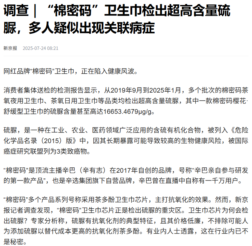 從2019年9月到2025年1月,多個批次的棉密碼茶氧夜用衞生巾、茶氧日用衞生巾等品類均檢出超高含量硫脲,其中一款棉密碼櫻花·舒緩型衞生巾的硫脲含量甚至高達16653.4679μg/g。