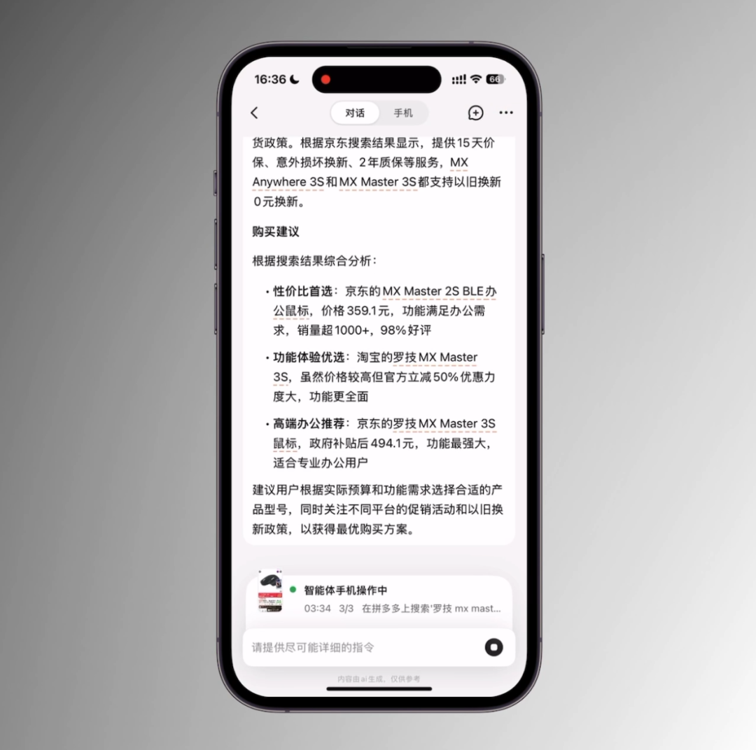 就比如這回、我想買個羅技的 Mx Master 鼠標,就可以讓 AutoGLM 幫我去淘寶京東拼多多里逛一圈,然後幫我找到最有性價比的那一個。