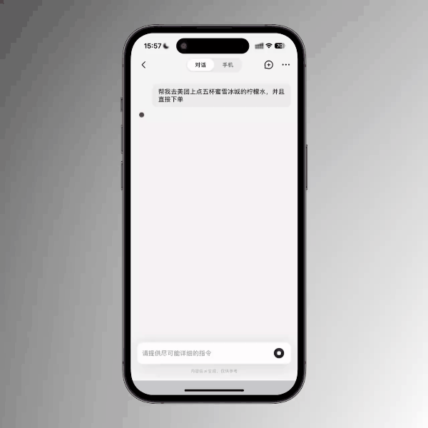 那麼價格打下來了之後, AutoGLM 幹起活來表現到底怎樣呢?我也幫大家簡單測了一下,就拿點飲料這個場景來説吧,我只需要直接表達想法:“幫我去美團上點五杯蜜雪冰城的檸檬水,並且直接下單。”