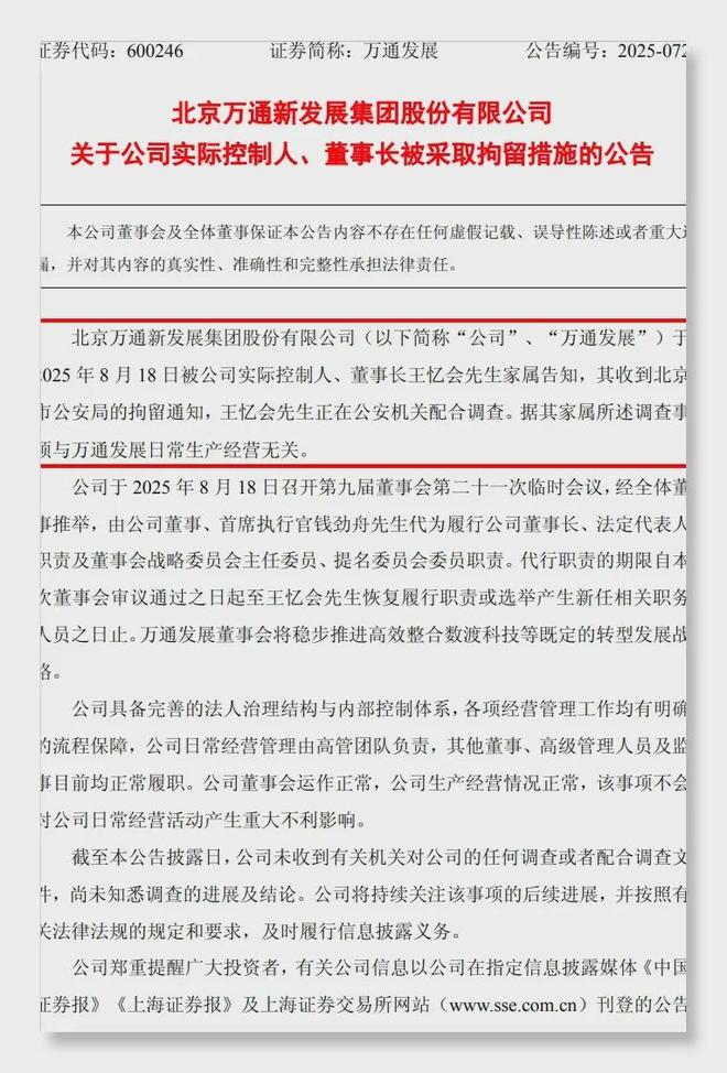 8月18日晚間,一則重磅消息震動資本市場,萬通發展發佈公告稱,公司實際控制人、董事長王憶會收到北京市公安局的拘留通知,目前正在公安機關配合調查。