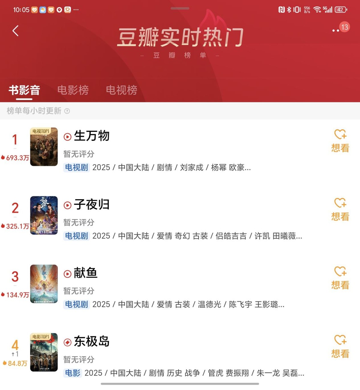 在豆瓣平台,《生萬物》憑藉高達693.3萬的逆天熱度霸榜了書影音總榜(無論電影還是電視榜它都是No.1),是第二名的足足2倍之多,近期最熱門的影視劇可謂實至名歸;