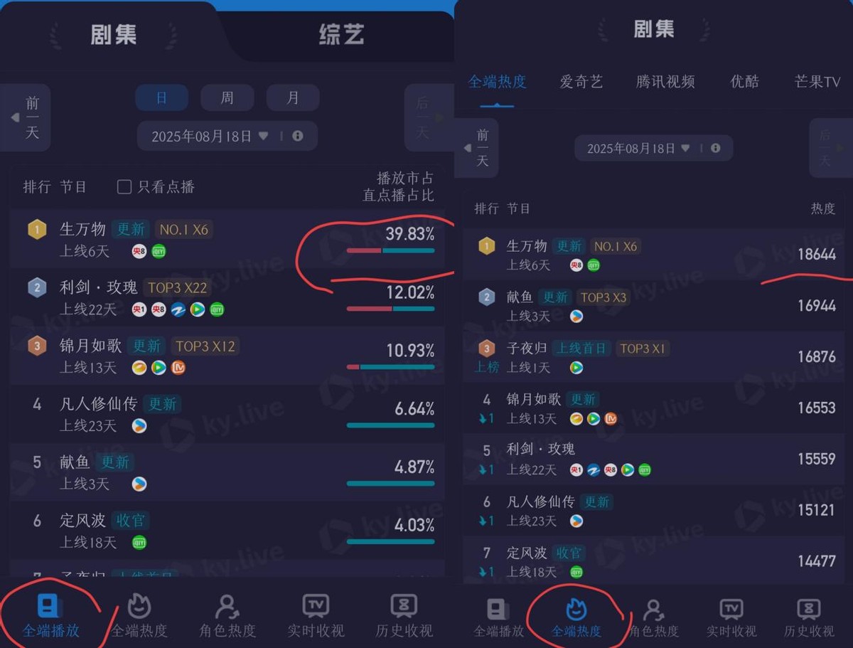 據酷雲統計,8月19日晚的《生萬物》在央視8套的收視率破4,達到了4.093%的現象級level,並且該劇還斬獲了全端播放市佔率(39.83%)第一和全端熱度(18644)第一兩項殊榮;