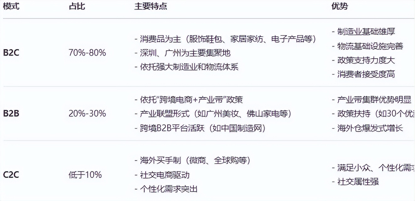 **B2B模式在廣東省跨境電商中佔比約20%-30%,主要依託"跨境電商+產業帶"政策。**廣東省商務廳廳長張勁松在2025中國(廣東)—RCEP成員國跨境電商交流活動上表示,廣東正致力於建設跨境電商示範省,並從三個方面着手推動電商高質量發展:一是抓"跨境電商+產業帶",計劃在三年內形成30個優勢產業帶,並培育300家骨幹企業;二是抓"跨境電商拓展新市場"專項行動,攜手頭部電商平台,開拓全球市場;三是做強廣州、深圳、粵東三大電商發展極,帶動全省21個跨境電商綜合試驗區提檔升級。