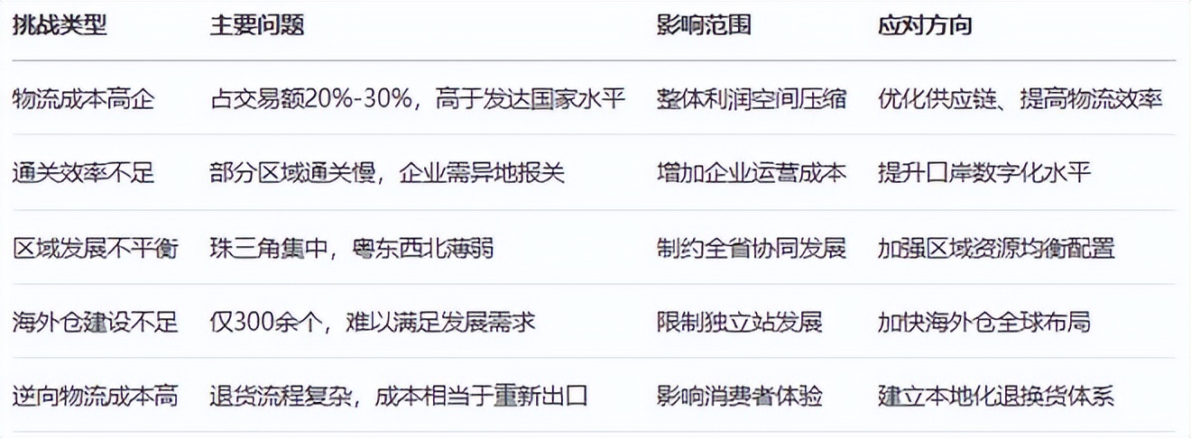 **第四,海外倉建設不足。**雖然廣東省政府大力支持跨境電商海外倉建設,鼓勵企業在"一帶一路"沿線國家和地區、區域全面經濟夥伴關係協定(RCEP)成員國開展海外倉建設,擴大歐美市場海外倉佈局,但到2025年,廣東省海外倉數量僅超過300個,與廣東省跨境電商的發展規模相比仍有較大差距。廣東省跨境電商企業中,有37%的跨境賣家已開始運營獨立站,另有35%的跨境賣家計劃佈局獨立站,但海外倉建設不足限制了獨立站的發展。