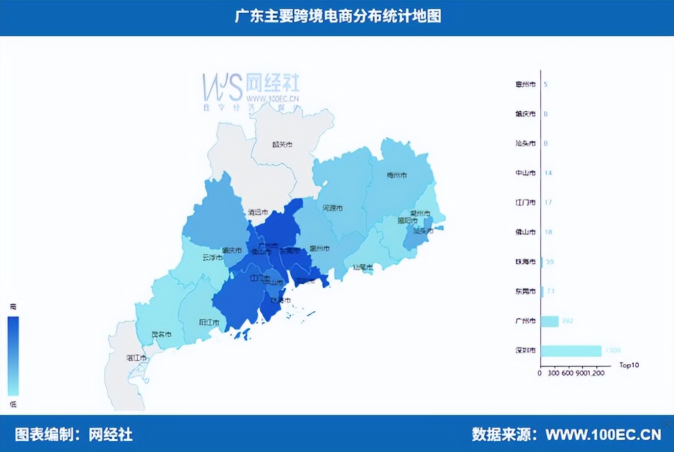 廣東省跨境電商企業分佈呈現出顯著的區域集中特徵,主要集中在珠三角地區,尤其是深圳和廣州。其中,深圳市以1308家企業的絕對優勢成為全省跨境電商的中心,廣州市緊隨其後,擁有392家企業。東莞、珠海、佛山等城市也分別有73、59、18家企業,形成次級集聚區。相比之下,其他城市如江門、中山、汕頭、肇慶等地的企業數量較少,分別為17、14、8、8家,而惠州僅有5家。
