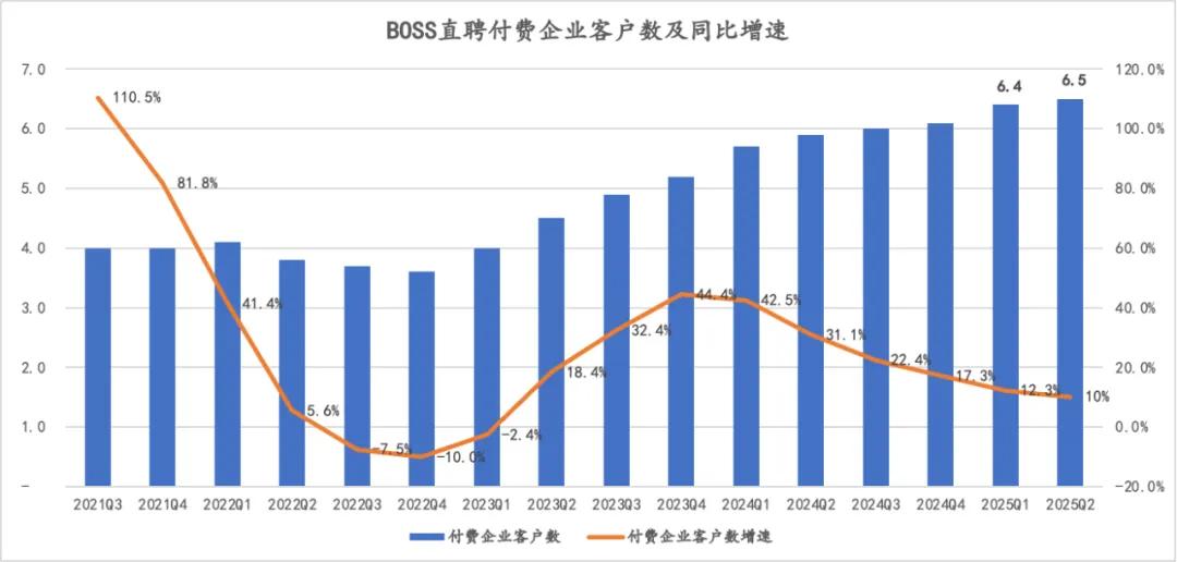 付費企業數量方面,截至2025年6月30日止的十二個月內,BOSS直聘付費企業客户數為650萬,同比上漲10.2%。